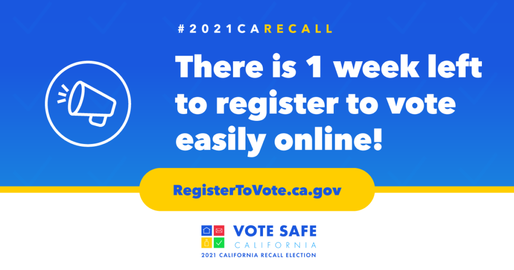 Want to participate in the #2021CARecall? There is 1 week left to register to vote easily online. Register now at RegisterToVote.ca.gov to receive your vote-by-mail ballot.